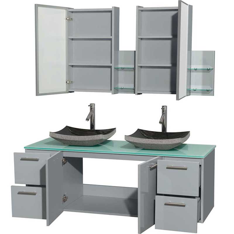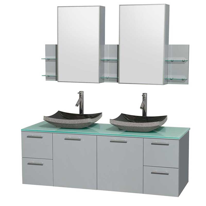 Amare 60" Double Bathroom Vanity in Dove Gray, Green Glass Countertop, Altair Black Granite Sinks and Medicine Cabinet