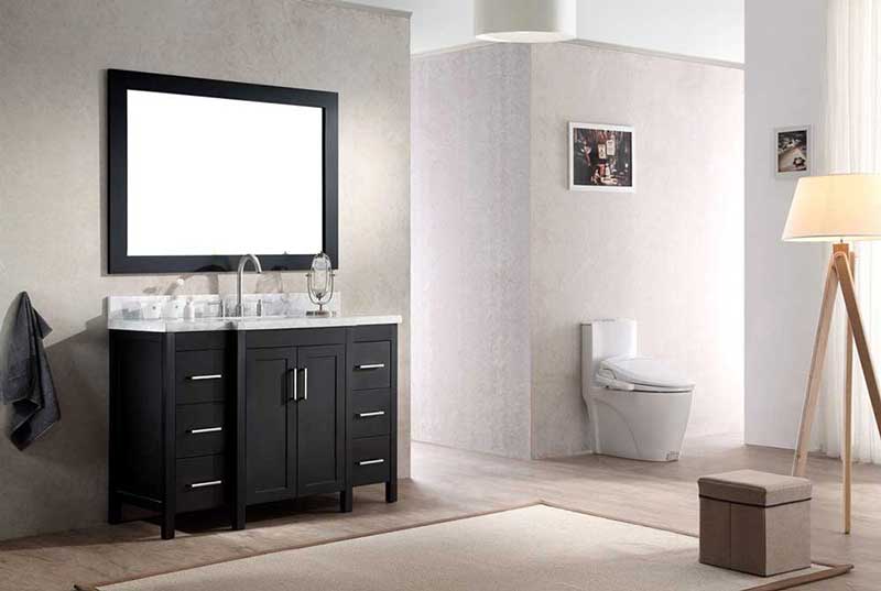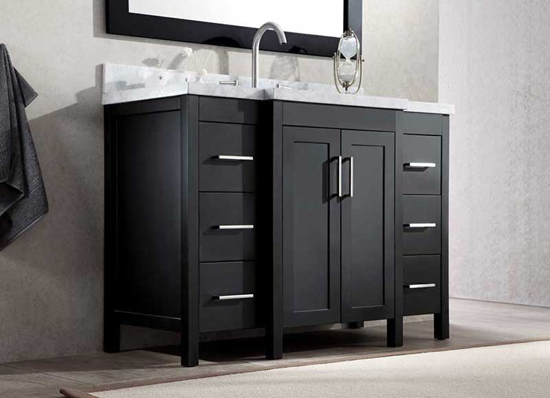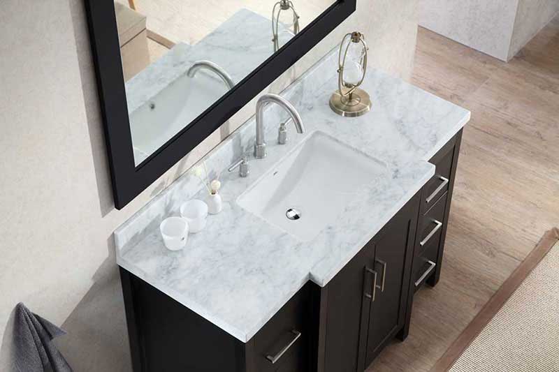 - Carrara White Marble Countertop w/ 1.5" Miter-Cut Edge and Matching Backsplash.