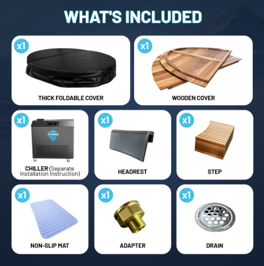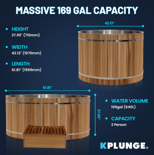 DIMENSIONS: 62×42×28 in. cold plunge with 24 in. soaking depth for single-user comfort; holds up to 169 gallons of water.