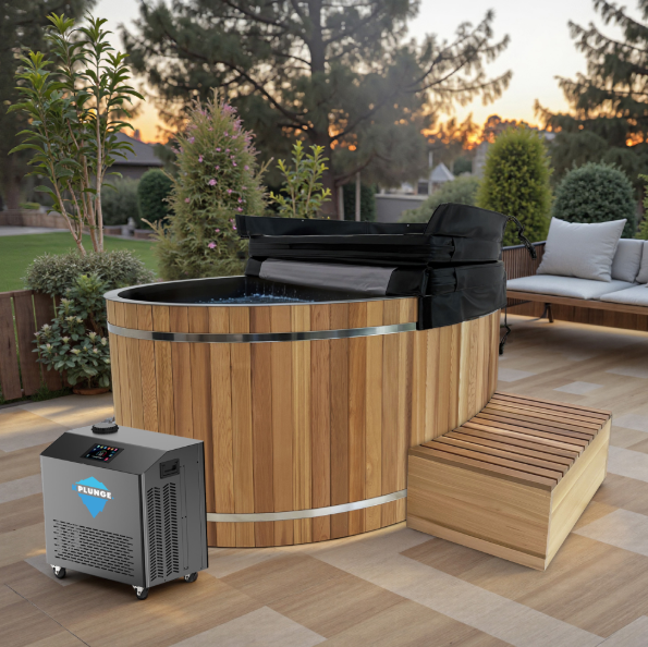 Upgrade your wellness routine with the KPLUNGE 62-in. Cedar cold plunge/hot tub with 1 HP chiller. Built for indoor or outdoor use, it features a cedar exterior, stainless steel interior, and 169-gal. capacity. Cools or heats water from 38°F to 104°F for full-body recovery or relaxation. Includes a cedar step, headrest, cover, and smart control via touch panel or WiFi app. The oval shape allows full-body immersion- perfect for athletes or anyone seeking morning energy or evening relaxation.