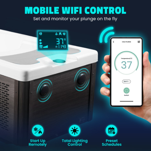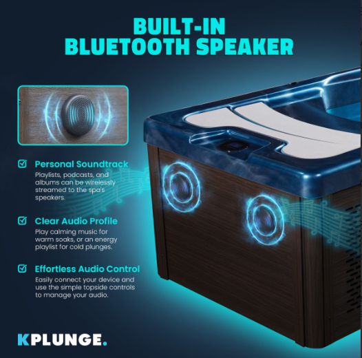 Relax and recover with the Borealis 69-in. cold plunge and hot tub with built-in KPlunge chiller in blue. Take full control with the WiFi app and adjust temperature 37°F to 104°F, lights, Bluetooth speakers, and 2-jets easily. An ozone system and water filter keep water fresh and clean. Use it indoors or outdoors— quick-connect hoses, wheels, and a carry handle make it easy to install and move wherever you need. Perfect for athletes, spas, or any home that wants easy, daily wellness.
