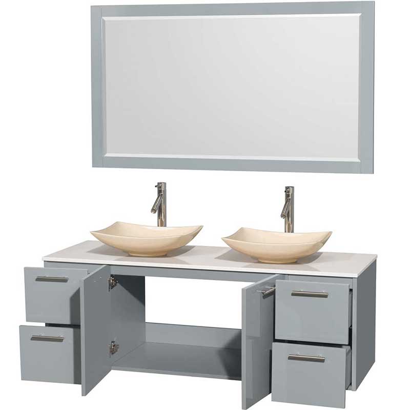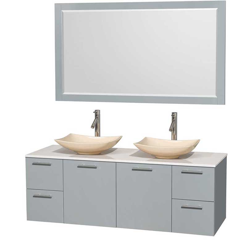 Amare 60" Double Bathroom Vanity in Dove Gray, White Man-Made Stone Countertop, Arista Ivory Marble Sinks and 58" Mirror