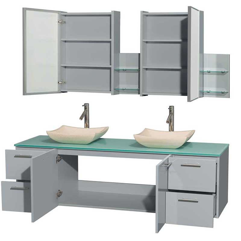 Amare 72" Double Bathroom Vanity in Dove Gray, Green Glass Countertop, Avalon Ivory Marble Sinks and Medicine Cabinet