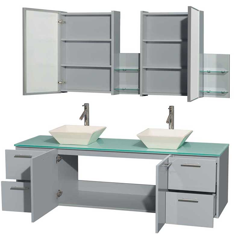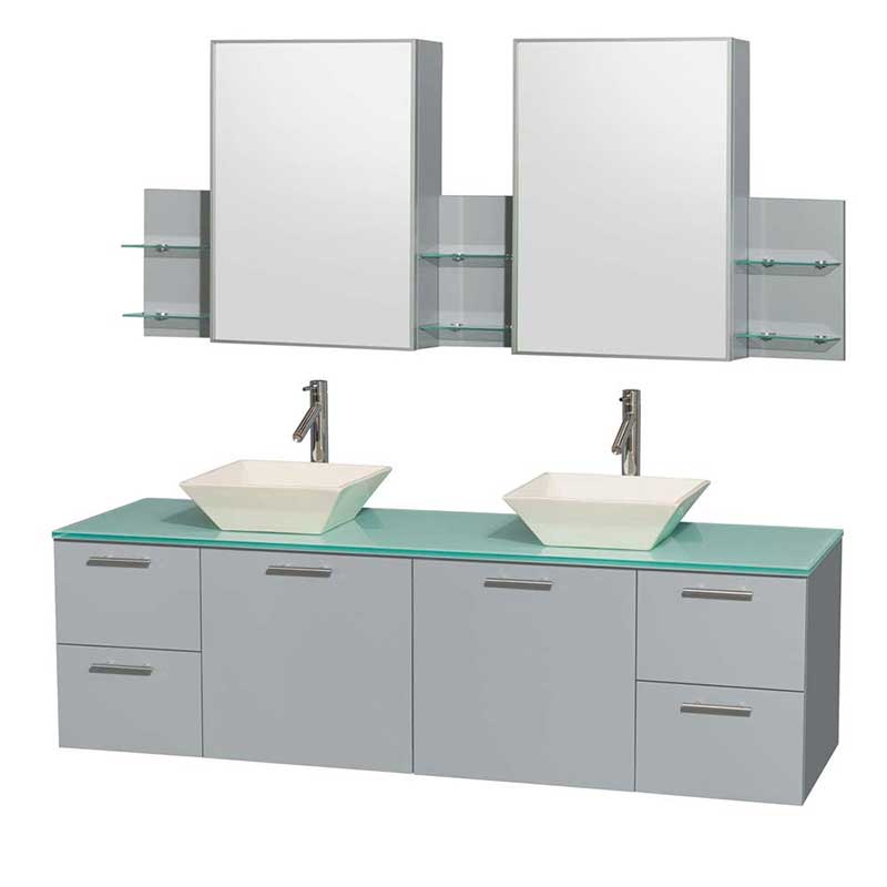 Amare 72" Double Bathroom Vanity in Dove Gray, Green Glass Countertop, Pyra Bone Porcelain Sinks and Medicine Cabinet