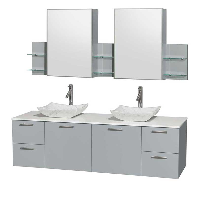 Amare 72" Double Bathroom Vanity in Dove Gray, White Man-Made Stone Countertop, Avalon White Carrera Marble Sinks and Medicine Cabinet