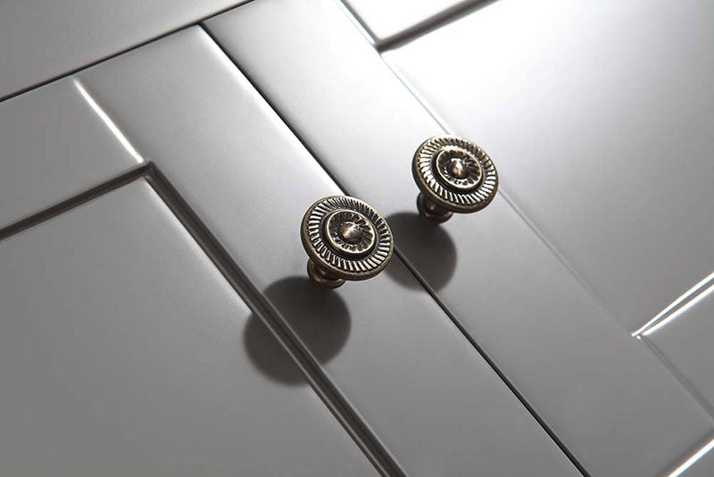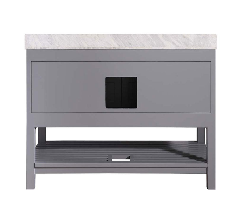 - Handmade Classic grey cabinet body accented chrome handles and topped with a Carrara white marble counter