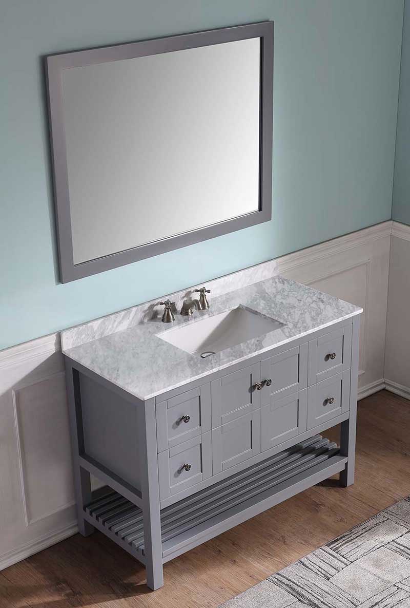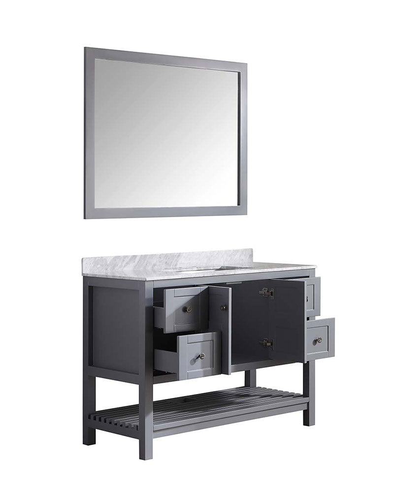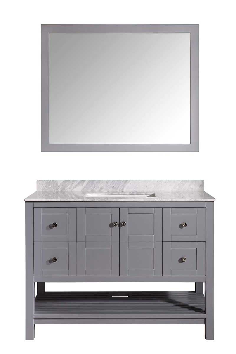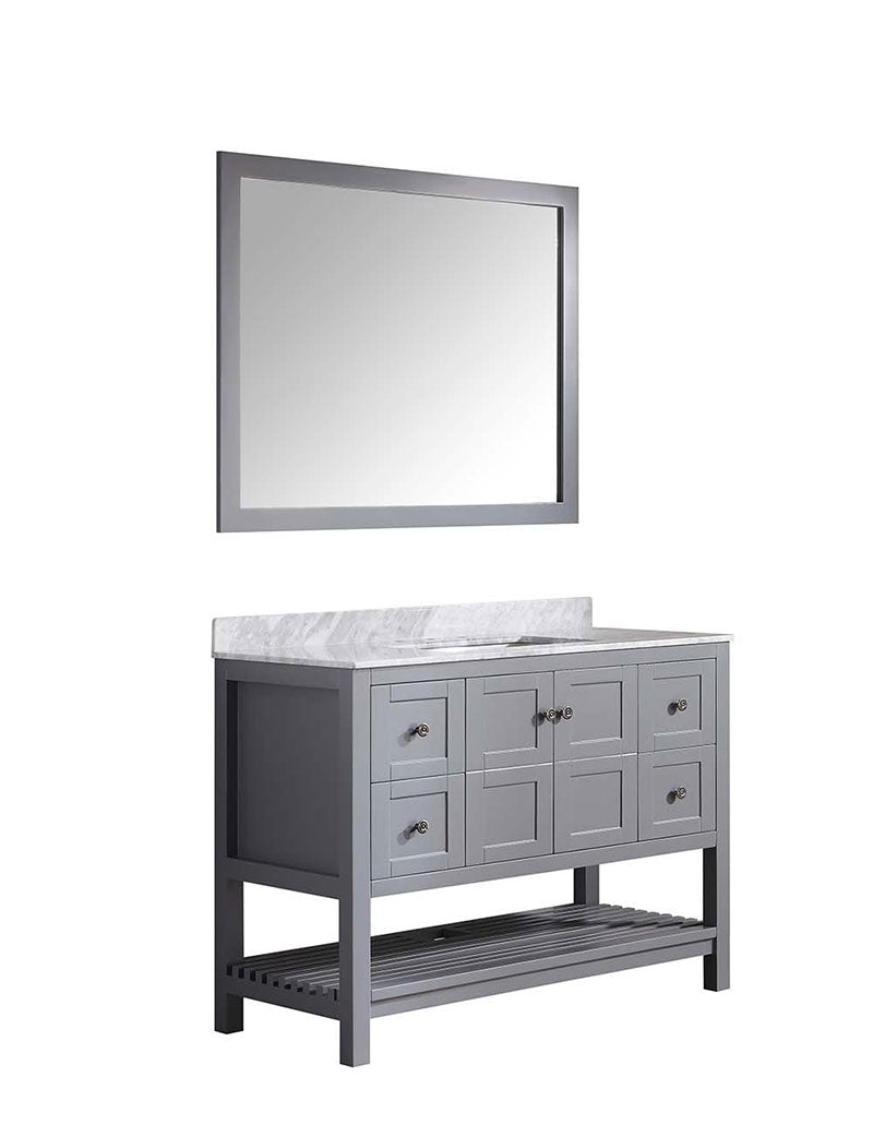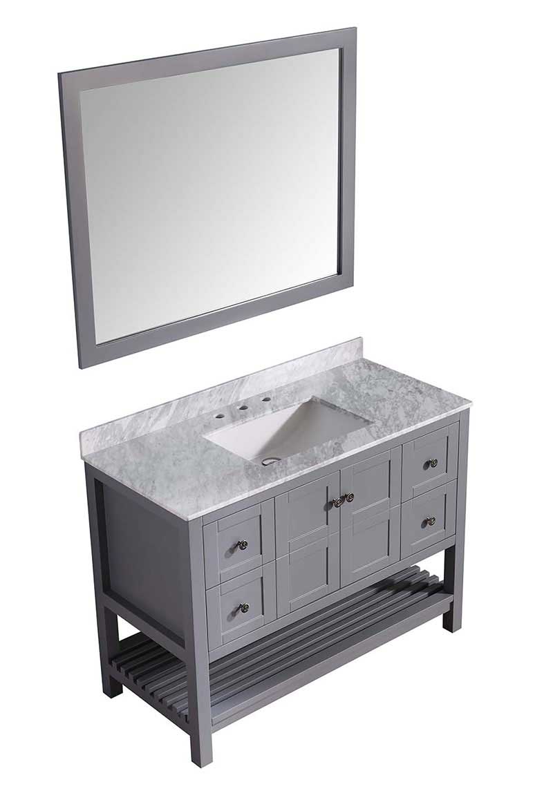 ANZZI is introducing a new breed of bathroom vanities that emphasizes elegance and class while offering spacious storage and high end performance. The Montaigne comes with a Carrara white marble top and a body with a rich grey finish shielded by ANZZI's Paladin Protection finish which guards against scratch and marks ensuring a long lasting unblemished finish. The Montaigne also boasts ample storage space hidden behind soft closing elegantly crafted drawers. The wall mounted matching frame silver glass mirror compliments the modern look and feel of the vanity. Make the Montaigne a part of your collection and elevate your bathroom to the luxurious oasis you deserve.- Included: Grey color vanity body, Carrara White Marble counter top, white ceramic basin sink, Grey wall mounted mirror, all accessories and mounting hardware